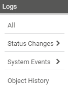 Click to show log information for all objects in your configuration. Hover over Logs to show other options.